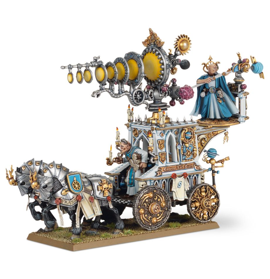 The Luminark of Hysh is a majestic and incredibly ornate kit that would stand out in any Warhammer Age of Sigmar collection. The elaborate carriage evokes a reliquary with its ornate, gothic arch and skull motifs, and is covered in astrological symbols and candles. The carriage bears an enormous device, featuring lenses of increasing size, and is bedecked in icons. A further platform behind these lenses bears a long-robed Acolyte, and another can be seen standing within the carriage. This enormous contraption is pulled by two horses bedecked in resplendent armour.