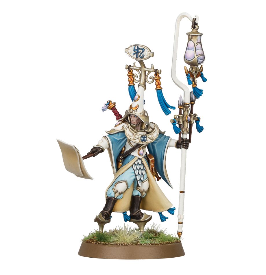 Carried above the ground they manipulate on long daethar shoes, the Calligraves are excellent support mages able to embolden their allies and strike down their enemies. The sword they carry isn't just for show either – in a pinch these arcane specialists are just as capable as any Lumineth hero of fighting back with a length of cold steel.