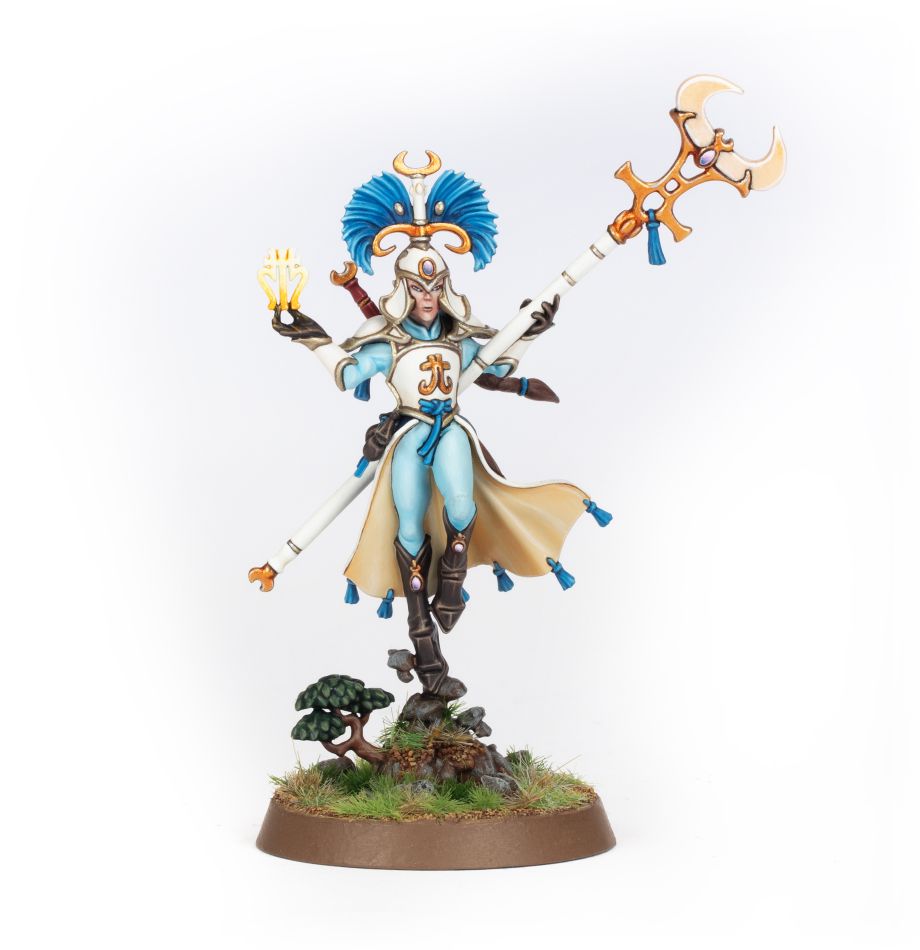 Scinari Enlighteners are amongst the pre-eminent battlemages of Lumineth society. Renowned across the realms for their profound knowledge and thoughtful deliberation, these Scinari are experts in conjuring blinding light, searing beams, and banishing abjurations, and especially adept at turning the harm inflicted upon them back upon their enemies.